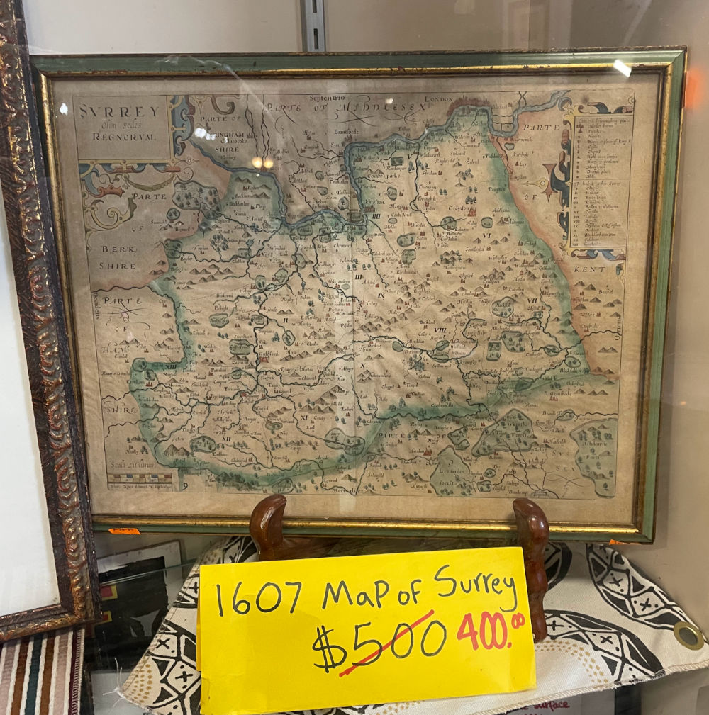 Alas, alas I soon discovered that all the items I wanted were priced too high for a reseller. Good prices for regular folks, but not for my needs. This cool 1607 Surrey map was priced at $400…about what it sells for retail.