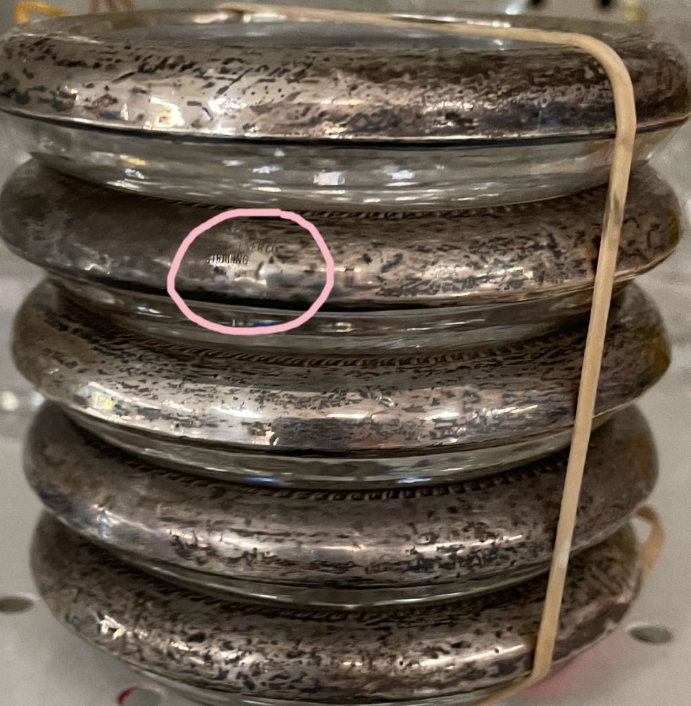 At a quick trip to my neighborhood thrift store I spotted these glass and silver coasters, circa 1950s-70s. I looked and looked for any kind of mark on them. I was 95% sure these had sterling silver rims. But I never found a mark in the store so I left them behind. Back home I was looking at the photo I took of them.