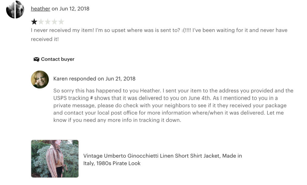 Case in point–A gal left me a 1-star review because she said her item never arrived. She didn’t reach out to me first. After leaving the review she sent me an angry message asking what was I going to do about it. The tracking information showed that the item had been delivered to her address the week before. So either she was lying to scam me for a refund or the item was stolen/mis-delivered.