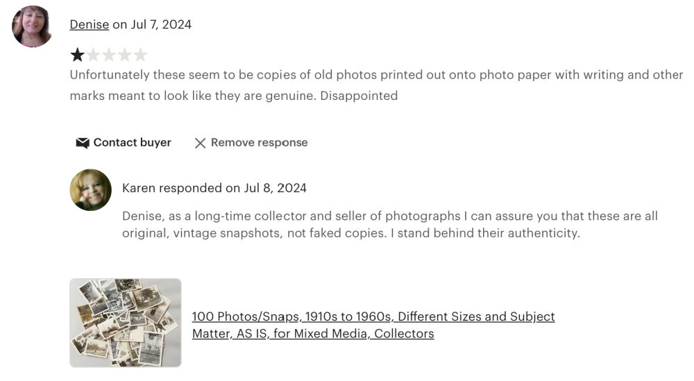 Case in point–More recently, as some of you know, a buyer decided that a batch of 100 original snapshots she received were copies that I’d faked. The allegation was so ridiculous and clearly not true that it was laughable. But she didn’t reach out to me to return them, instead decided to leave me a one-star review to hurt my business. Wow.