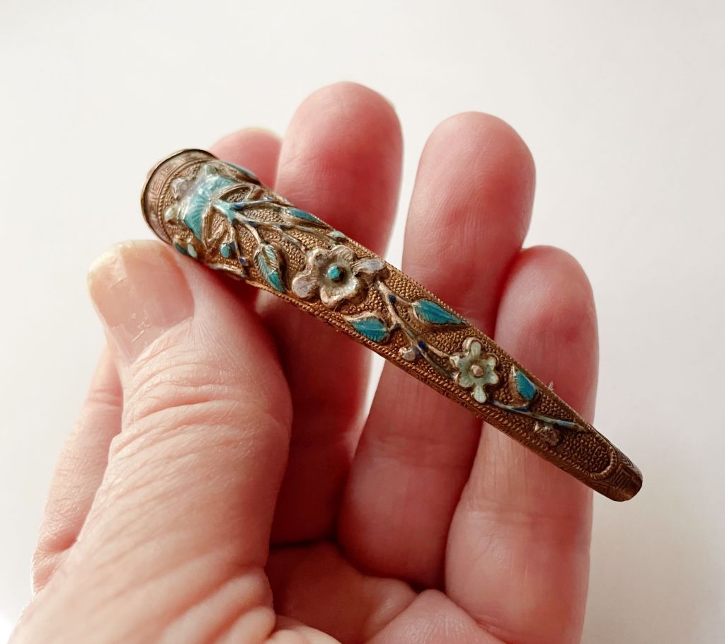 I thought this vintage/antique silver enameled pin was to hold a tussie mussie (small bouquet), but when I saw the markings on the back–“Silver China Family”–I knew this was a finger/nail guard pin!