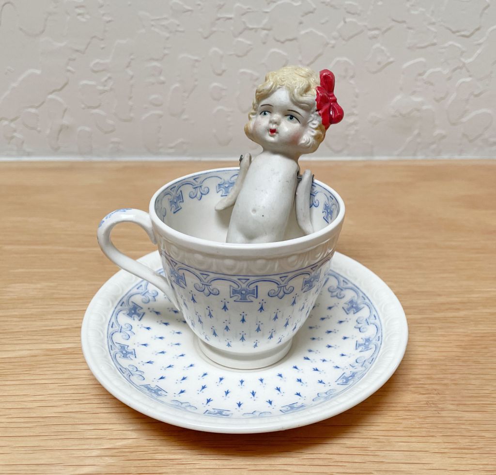 Here’s an unexpected grouping whose only relatedness is cuteness! I bought this lovely old Spode teacup, but found out after I got home that it was crazed inside reducing its salability. So I put this vintage frozen Charlotte doll figure in it and really liked the combo. I’ve now listed these together and someone put it in their cart. Of course that doesn’t mean they’ll follow through and buy it, but it does mean they like it enough to think about it!
