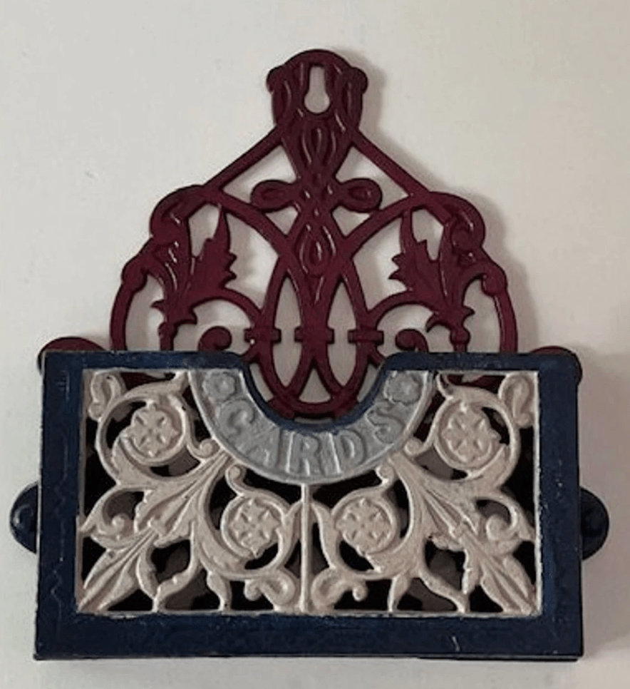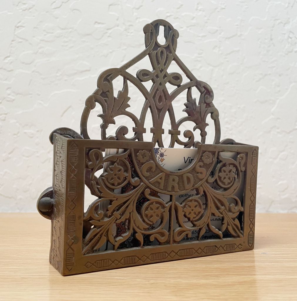 This Victorian-era cast iron card holder (originally meant to be hung on a wall) has been used to corral my biz cards over the years but I rarely give out my cards anymore. Though I still really like this piece, I decided it was time to list it. (I’ll keep it on my desk till it sells!)