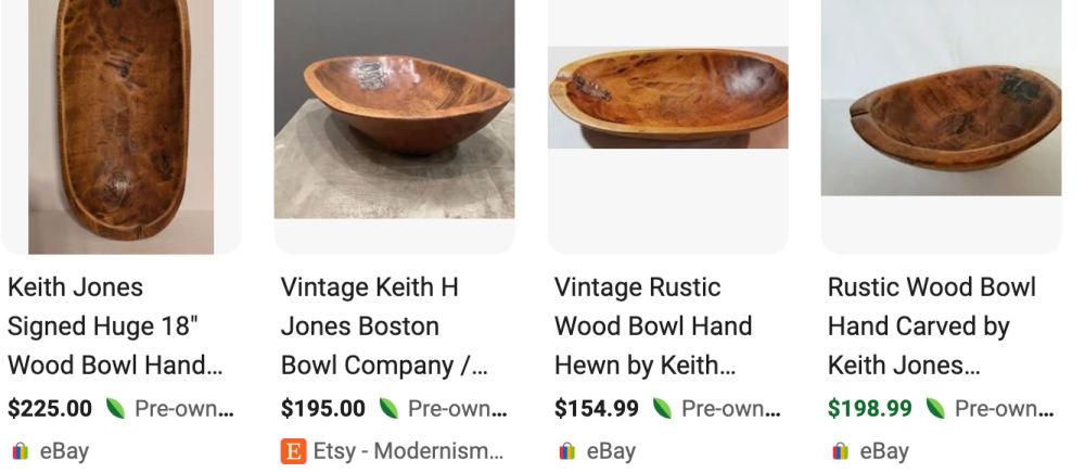 Back home I did some research on this Keith Jones piece and was pleasantly surprised–on several fronts. First, Keith created The Boston Bowl Company in 1986 to handcraft these primitive-style bowls. He then closed the company around 2006 or so to work in Africa with Hands Across Nations. But his bowls, despite being created with faux wear, are sought after! They sell well and here are a few current listings.