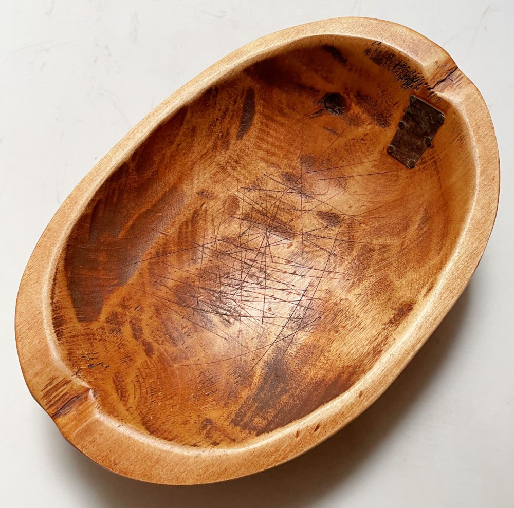 Went to my favorite boutique thrift store today and gave it a good going over. In the end I bought two things, but one was head and shoulders above than the other…and I almost didn’t buy it. It was a carved wood bread bowl with scratches and a metal patch. The scratches confused me–why would anyone be cutting things in a bowl?! Not sure about the patch either, but I liked it and the bowl was signed and dated. But I put it down and walked away. And then I went back to it. In the end I decided it was worth the gamble.