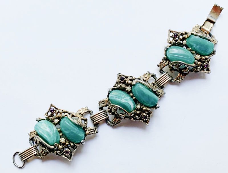 There’s a cool Lisner bracelet, some MCM glass bead necklaces, a stretch bracelet lavish with stone beads bought in Austria and an antique sterling silver brutalist brooch. Lots of neat pieces. I priced the bag at $55 which helps me recoup a bit of my original costs while still providing enough room for profit for the right buyer.