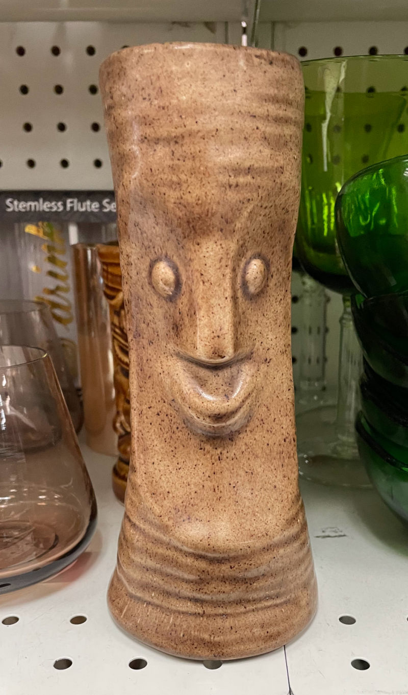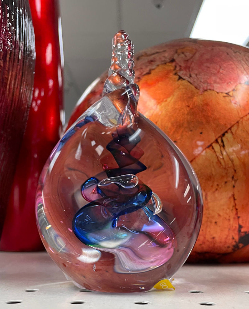 This Tiki hobbyist piece signed “Dot 1978” (priced at $3.89) was so fun. Turns out it’s a “Tiki Bob” image and some vintage Tiki Bob pieces fetch $$$, but as a hobbyist piece this wasn’t one of them. (I could have sold it for $15 to $25.) The hand-blown glass piece was somewhat pretty, but unsigned and felt clumsy and a bit odd.