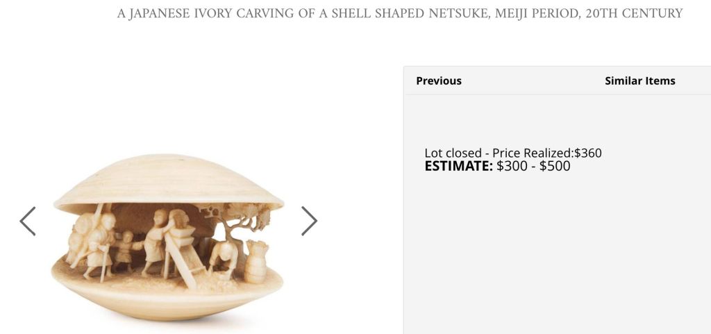Turns out it was a Japanese netsuke! But was it an ivory one selling in the $$$ or a celluloid one selling for much less? And of course, if it was ivory, it would be almost impossible for me to sell.