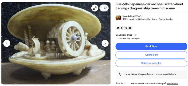 And my last item was curious. I didn’t know what to make of it (priced at $3+). It was a clam-shell carved thingy with a moving wheel.