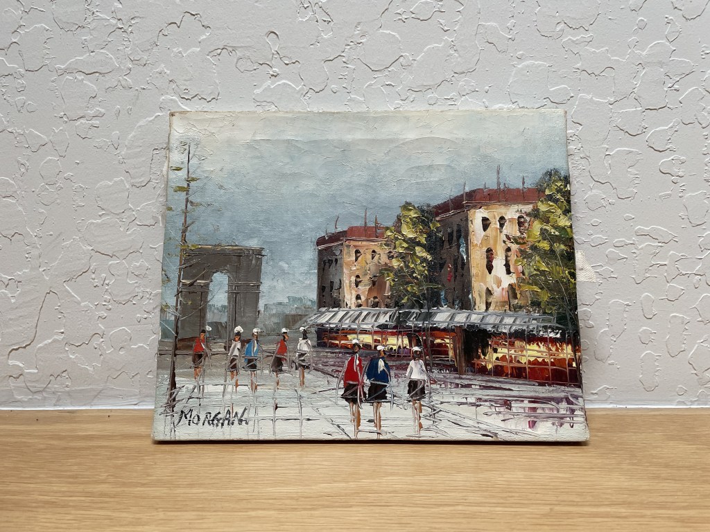 Strangely as I was pulling a sold item from one of my inventory bins, I spotted this small Paris painting and I had a niggling feeling that it wasn’t listed…and I was right. How had this dropped off the radar? Why was it in storage? Well, it’s listed now! The signature is credited to British artist Albert George Morgan (1848-1930). I’m dating it to the mid-1920s with the little cloche hats and the just-below-the-knee skirts.