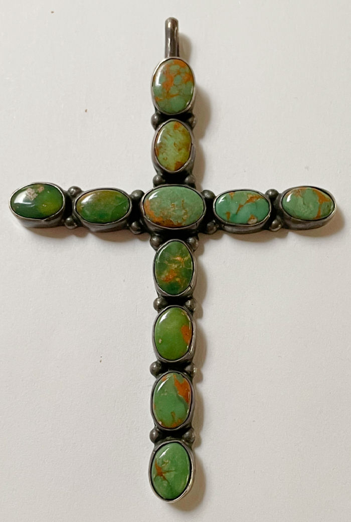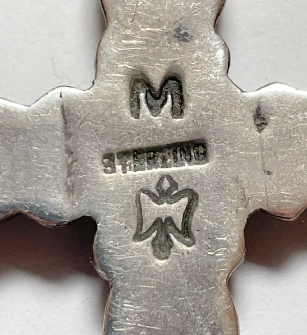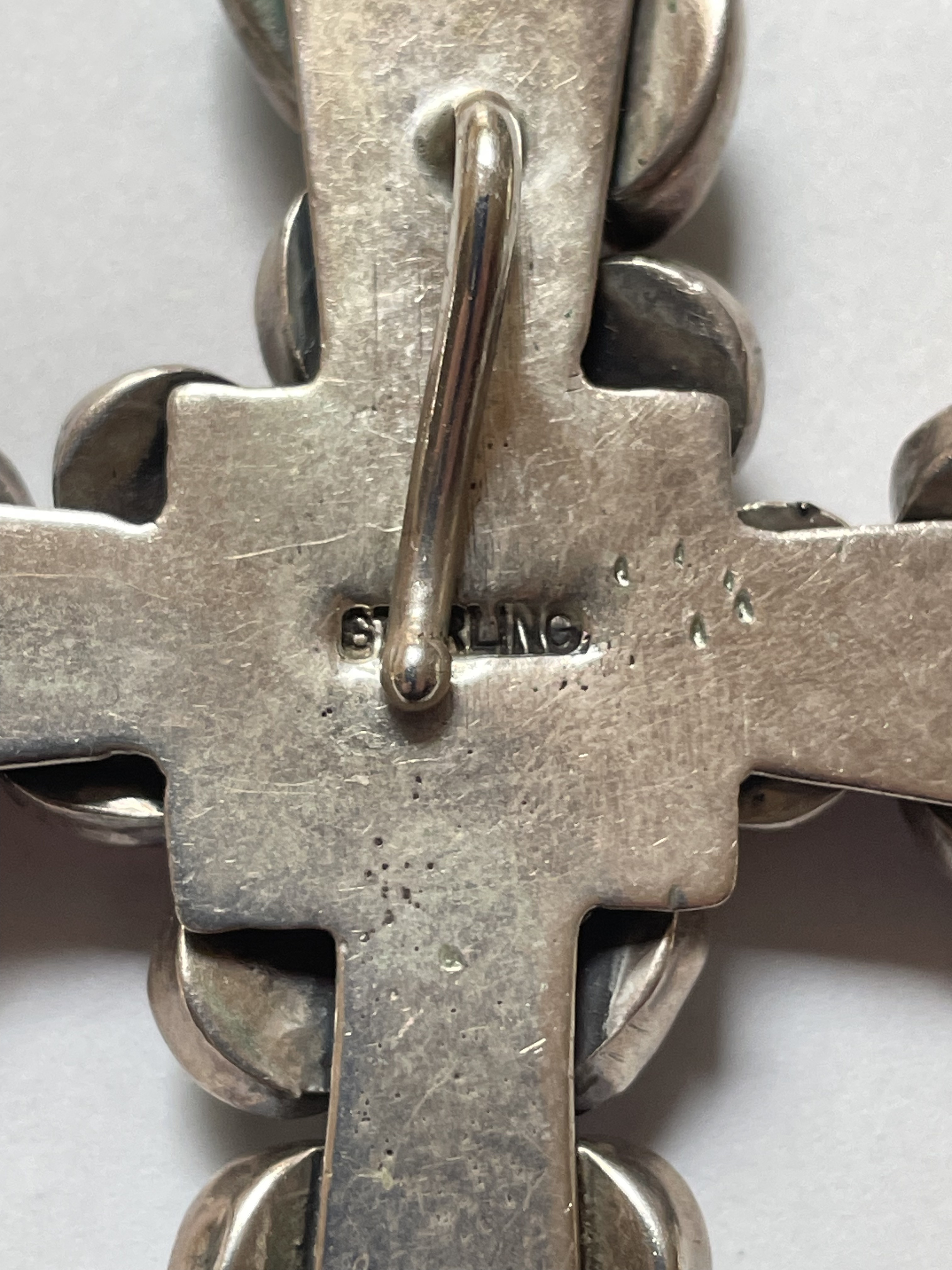 My Mexican pendant was made by designer Cecilia Tono in the mid-20th century. The other cross is likely Navajo, but I have not been able to identity the designer–possibly Arnold Maloney, Melissa Yazzie or Mildred Parkhurst. (Art-amerindien is my go-to website.)