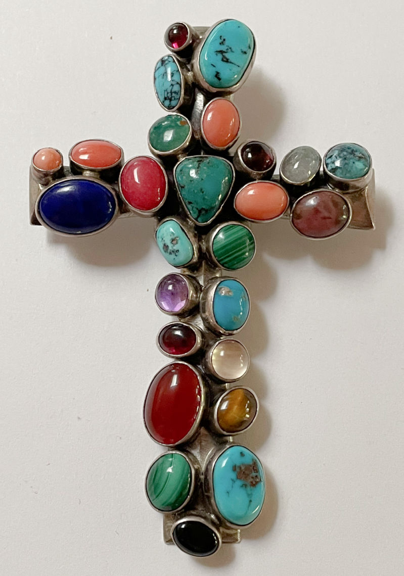 As time went on what I was drawn to evolved and included more ethnic pieces. Here are two of my favorites. The gem-encrusted cross is a Mexican piece in the style of Matilde Poulat whose elaborate designs (signed MATL) feature amethyst, coral and turquoise set in sterling silver. The simple signed Native American cross is set with lovely green turquoise.