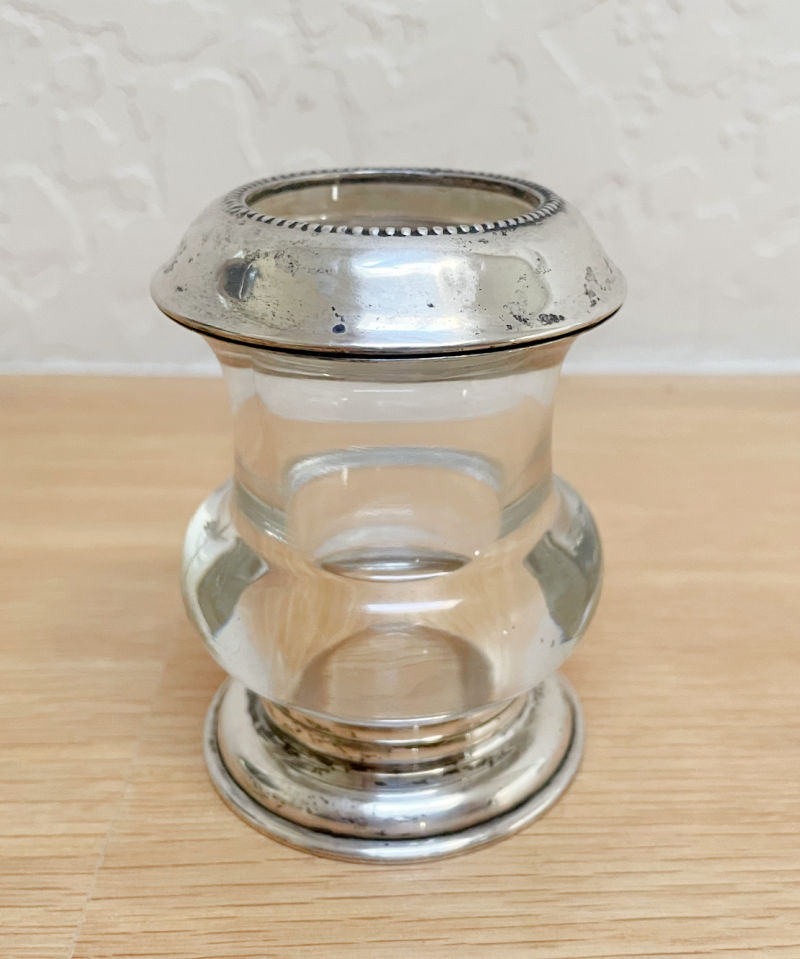 I also bought this vintage Frank Whiting glass toothpick/cigarette/match holder with sterling silver rim and foot. Just a nice thing! Nowadays I would use this for Q-tips, eyeliner pencils or a bouquet of wildflowers on a vanity table. I’ll list it for $45.