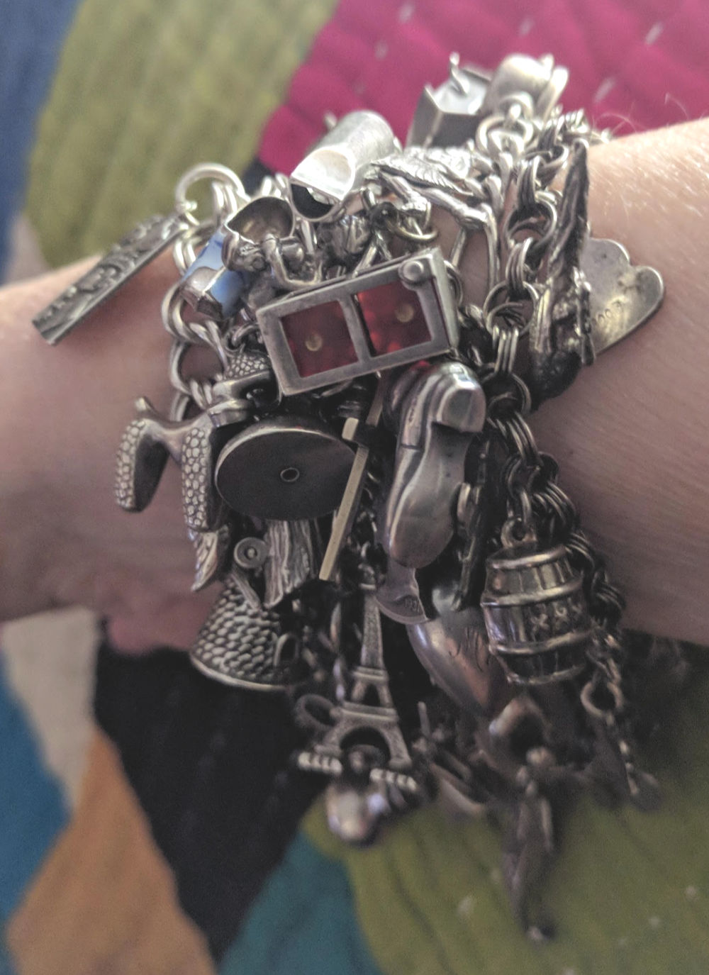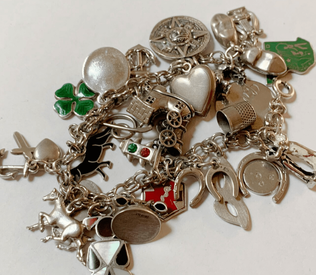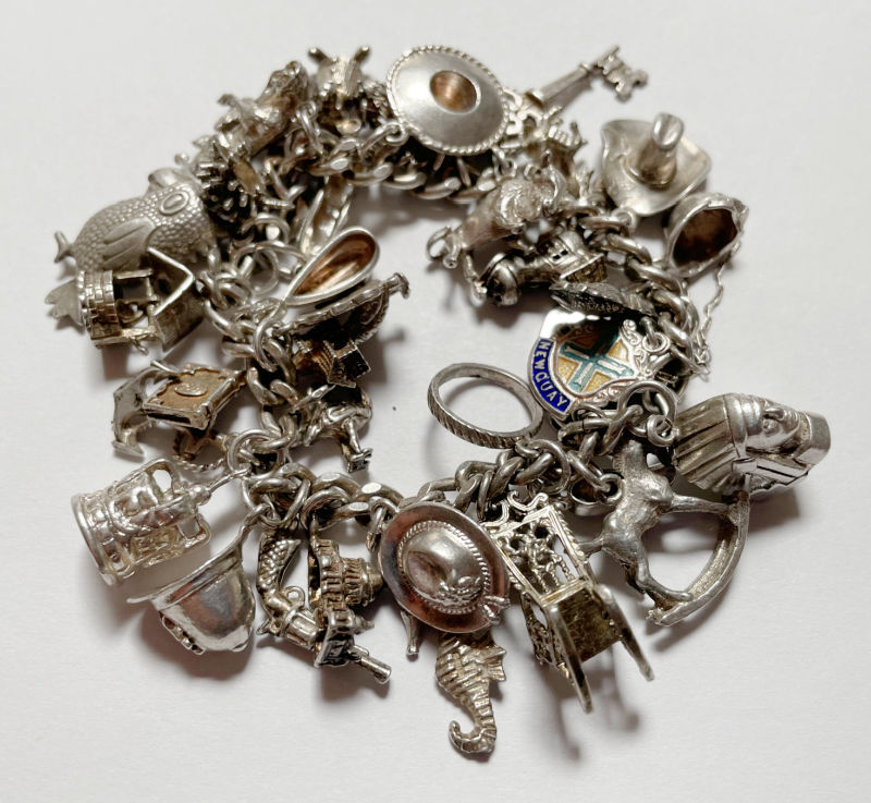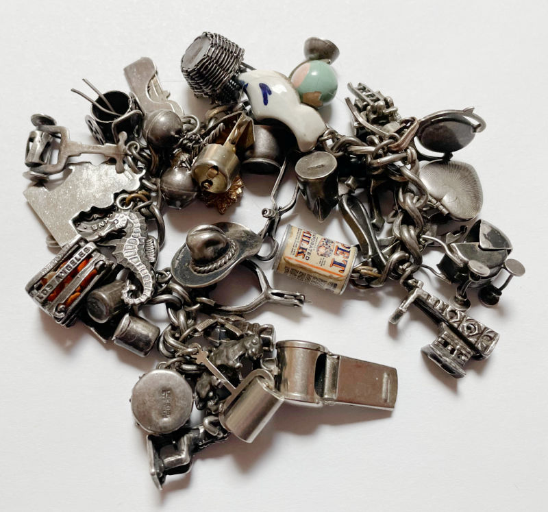 If you’ve read my blog for any length of time you’ll know I’m a fan of older sterling silver charm bracelets. I collected them for decades and sometimes pile them up on my wrist when I go out (seven is my max so far!). And I can tell you it’s so fun wearing an armful of jingly charms.