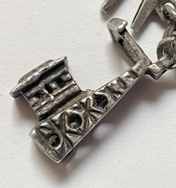 This vintage 1970s-1980s bracelet came from England and naturally has very specific English charms–a crown and Bobby hats–but some unexpected ones too.