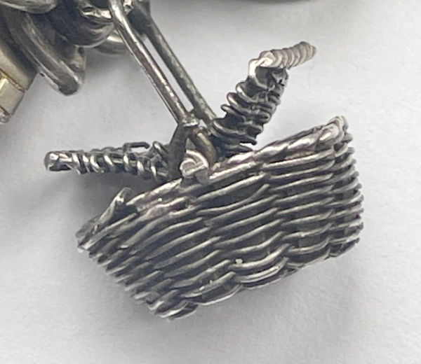 Amongst all the charms it has a scarce movable trolley that goes up a mountain and a blister pearl piece that is actually a small pendant someone attached as a charm. The Mexican woven picnic basket’s lid opens on both sides. How cute is that? Not sure on the prices on these yet.