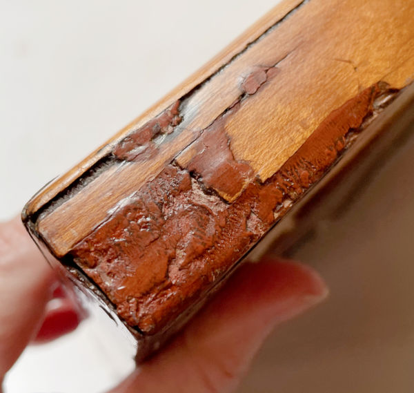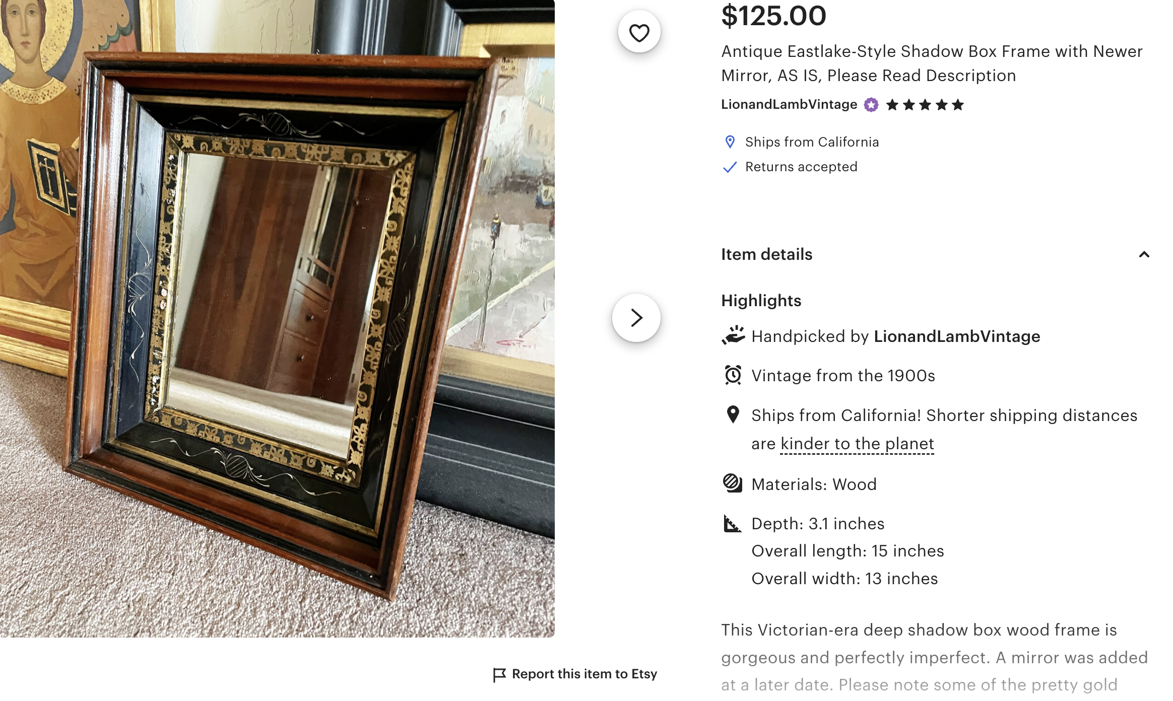 Older wood frames tend to be heavier than newer ones and original glass may be wavy or have bubbles. The back boards are usually wood held in places with nails. This Victorian Eastlake-style frame with a newer mirror captured my attention right away. I was tempted to keep it! (Paid $16.69 in 2024 at Goodwill)