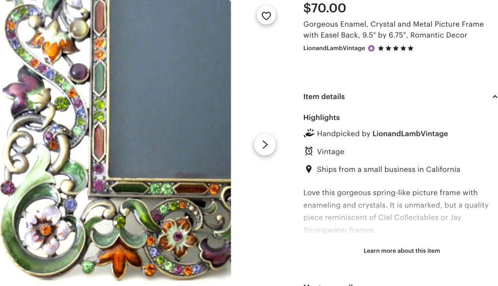 I’ve never been a fan of “fancy” frames, but this one was just gorgeous and I don’t use that word lightly. The enameling and crystals were fantastic. It was unsigned, but names like Jay Strongwater and Ciel Collectables do very well. (Paid $3.45 in 2019 at Goodwill.)
