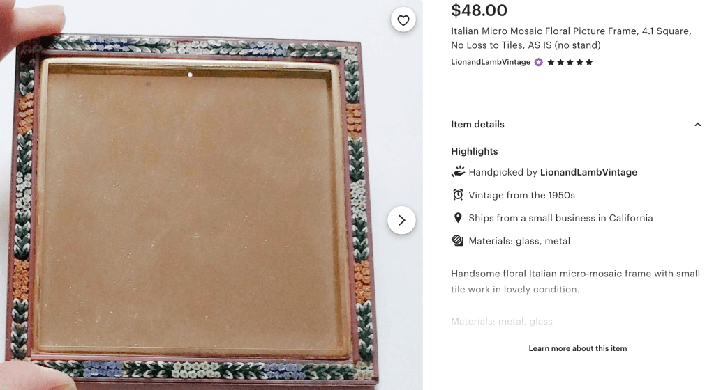 For the life of me I can’t remember where or when I got this or how much I paid, but folks love Italian micro mosaic items and the older and more elaborate frames are worth much more than this simple frame.