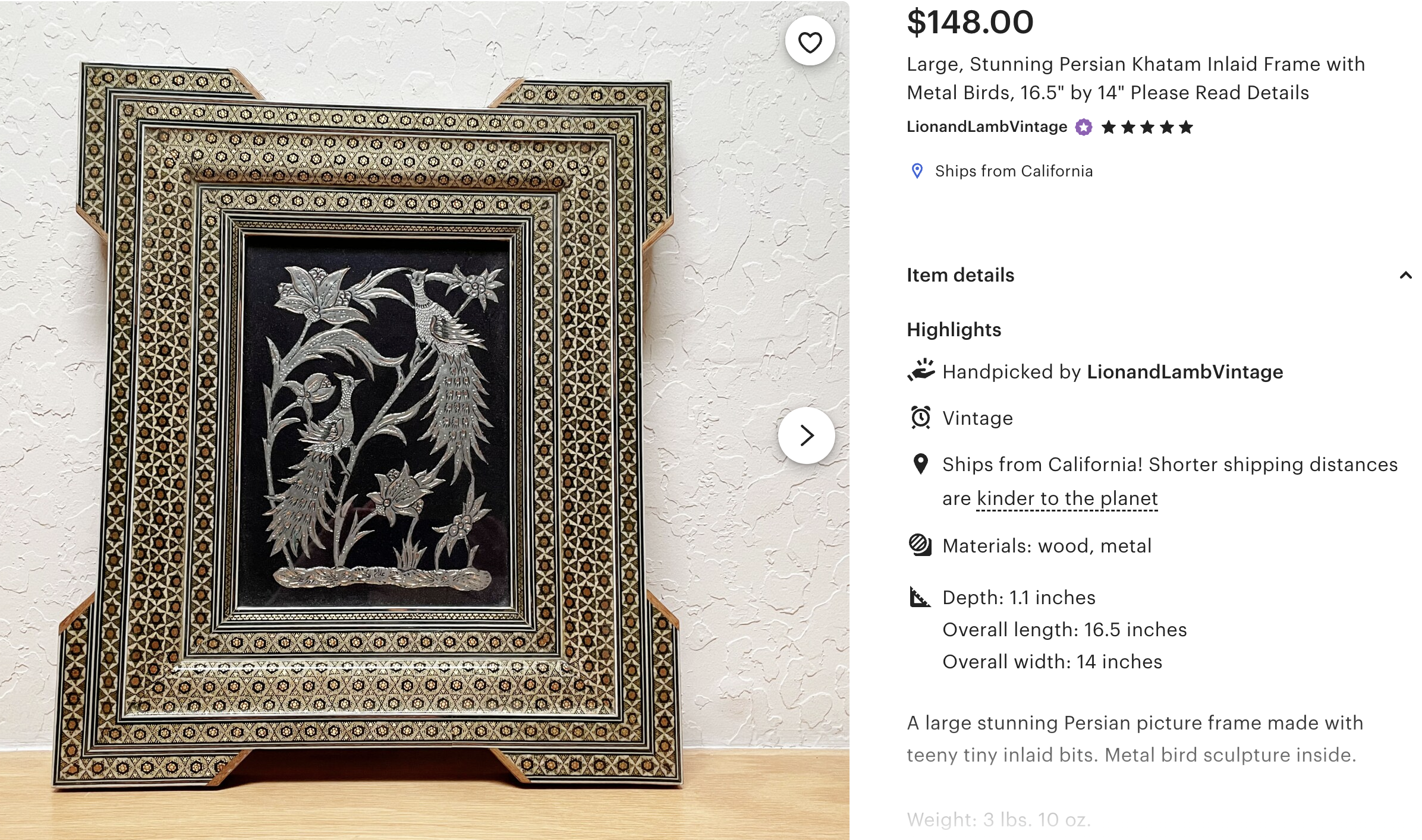 Persian inlaid frames are so exotic and lovely and this one was the largest I’ve ever seen. Perfect for those who love Boho decor. It has no great age, but I couldn’t leave it behind. (Paid $14.89 in 2023 at Goodwill.)