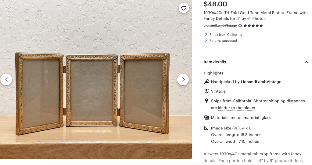 These frames have such a delightful old world look. I conservatively dated this one to the 1950s though I think it was likely older. (Paid $7.89 in 2024 at Goodwill)