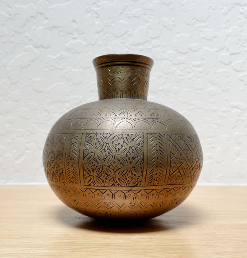 I don’t buy many brass vases/pots anymore, but this one was outstanding. The shape and etching were atypical of what I normally see and the weight was phenomenal at over two pounds! I’ve got this one on my mantel till it sells.