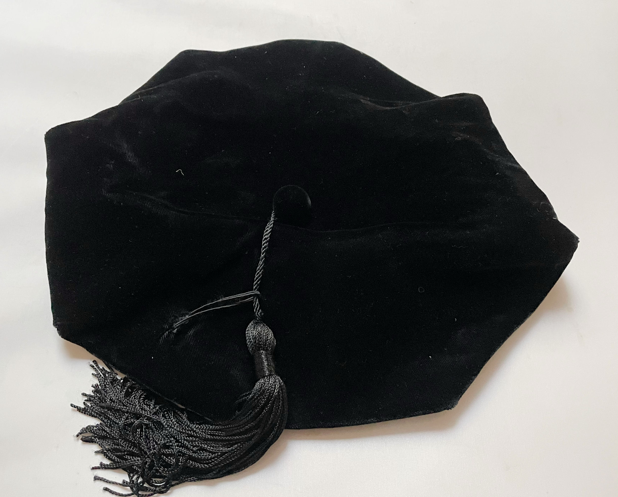 I found this 1950s black velvet doctoral cap (made by Cotrell and Leonard) tucked away in a cupboard. Here’s the shocker–I bought this at least seven years ago! The woman I bought it from said it had belonged to her deceased husband. Somewhere I have the gown the goes with it, but at least I finally got the cap listed.