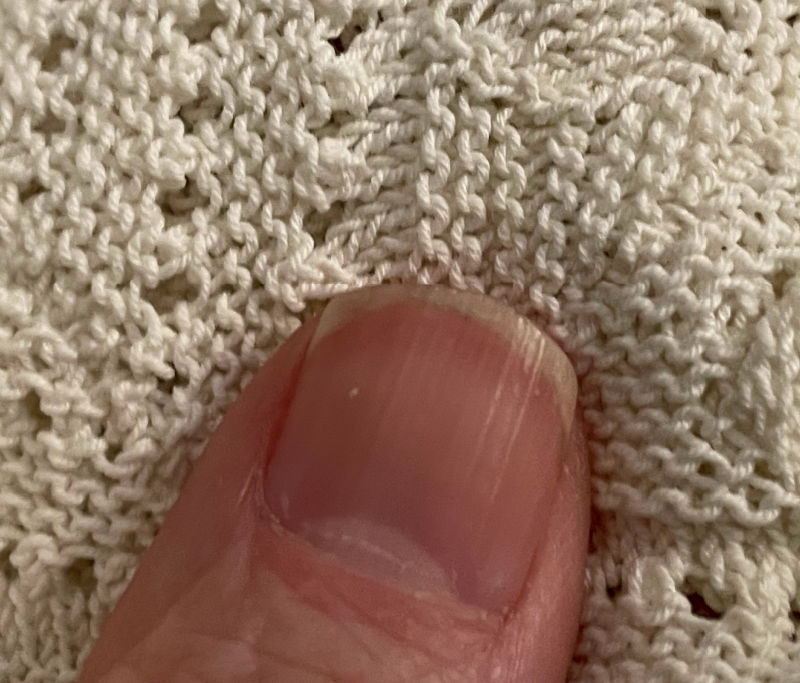 After finding dozens of things that I had to reject for one or more reasons, I did buy a beautiful good-sized antique crocheted spread at Granny’s Attic. [Correction: knitted thanks to a reader!] The seller had it marked as a “table spread”, but it’s likely a bed spread because one end doesn’t have a scalloped edge like the others. It has a few spots and light discoloration, but I can forgive it that because of the fine, small stitches and the fact that I could see no holes. (It’s surprisingly heavy.)