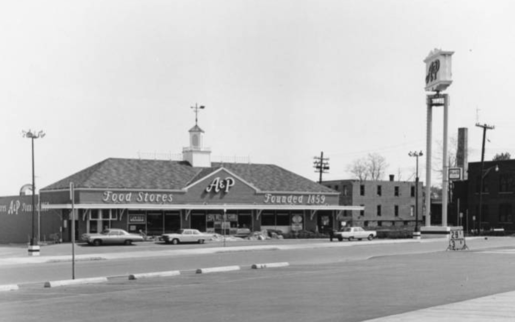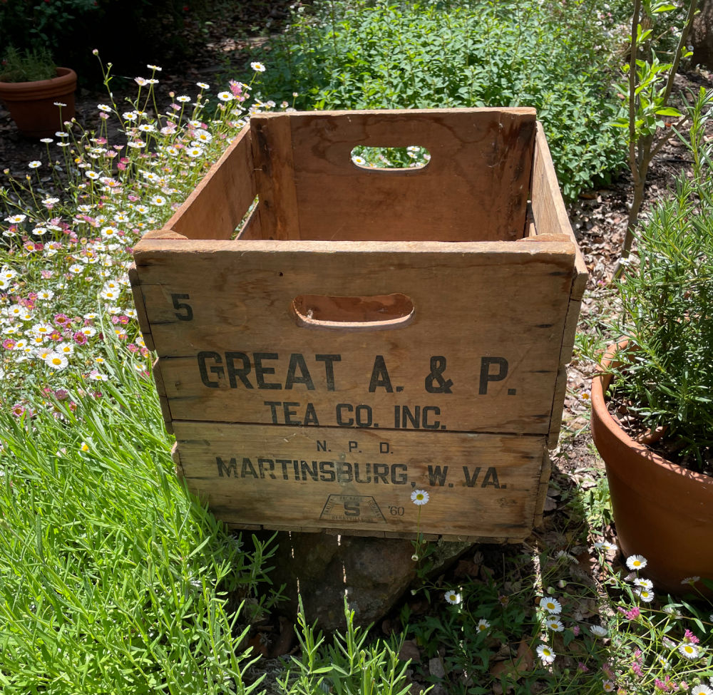 Years ago I signed up for FreeCycle–a site where neighbors offer up various bits for free to other neighbors. I have rarely responded to any of the listings, but one popped up the other day that grabbed my attention. It was for an old Great A & P Tea Co. wood crate. I remember shopping with my mom at the A & P grocery store in my hometown back in the day. In fact at the very store below!