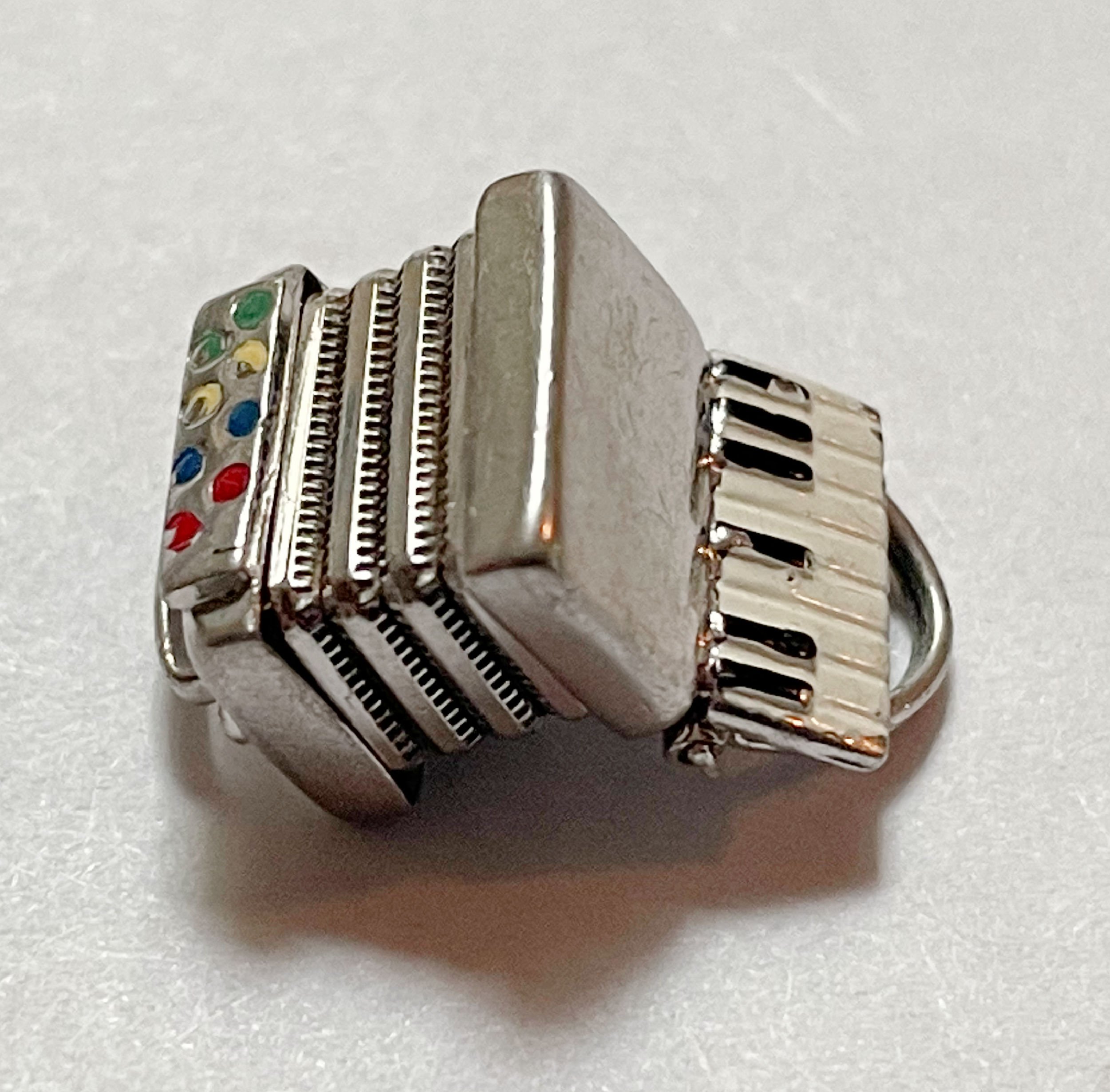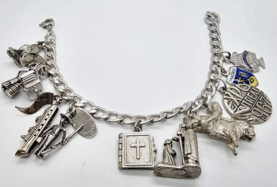 I do have one buying exception these days–I’ve been nabbing more vintage sterling silver charm bracelets. Six so far this year! Yes, I’ve been going overboard, but they are a passion of mine and charms do sell. The bracelet below was a particularly good find. I paid $55 (with shipping and tax) and one charm alone (a scarce mechanical squeeze box) sold for $68.