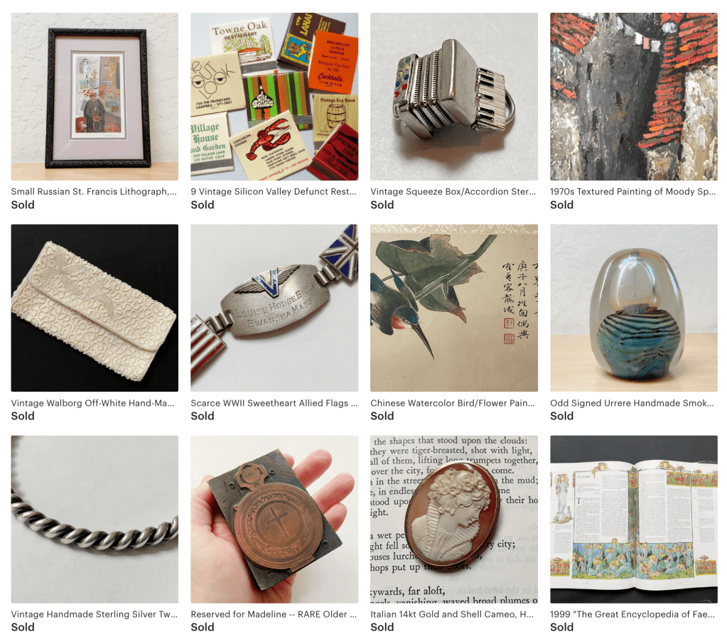 Now that we are well into the second quarter of 2025, I decided to take stock again of my Etsy vintage business looking at both the numbers and what was selling. No surprise that the numbers–visits, orders and revenue–are still down from 2024, but I did note that in both March and April more of my expensive items sold, including jewelry and artwork. (The lovely Chinese watercolor was a Goodwill find for $10 and it sold for $180, though I had to buy a shipping box for it ($8.74) which was so worth it! The vintage matchbooks were a fun $1 flea market find from years ago. These sold for $40.)