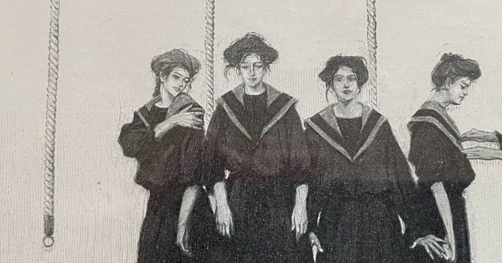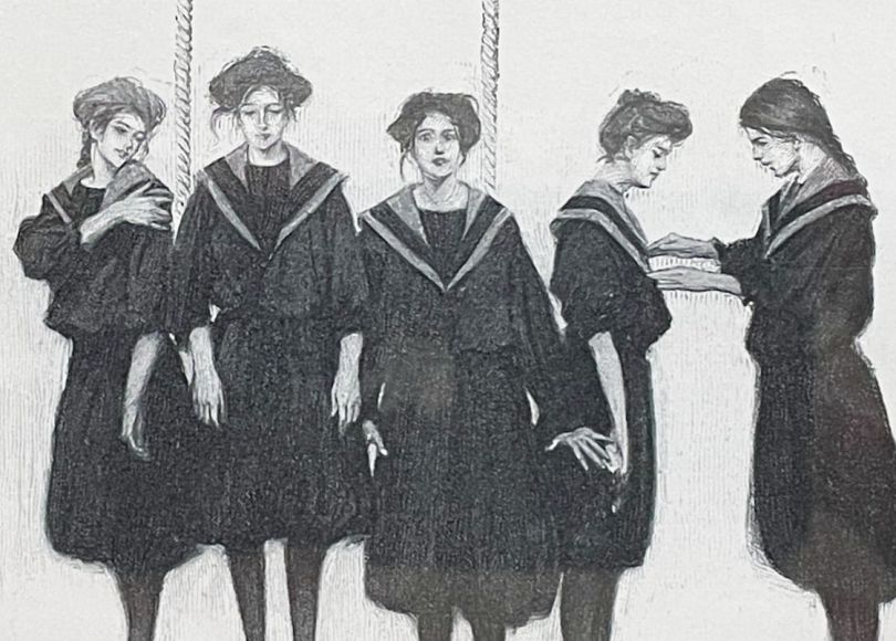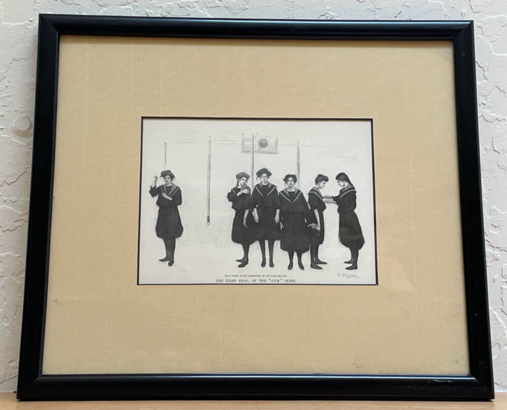 Do you ever find something so quirky and delightful that you know you have to buy it? This was me the other day when I spotted this small halftone engraving at my neighborhood thrift store. The professionally framed picture was of 1800s/early1900s girls in their new gym frocks. Such odd subject matter. I couldn’t leave it behind though finding a buyer may take some time!