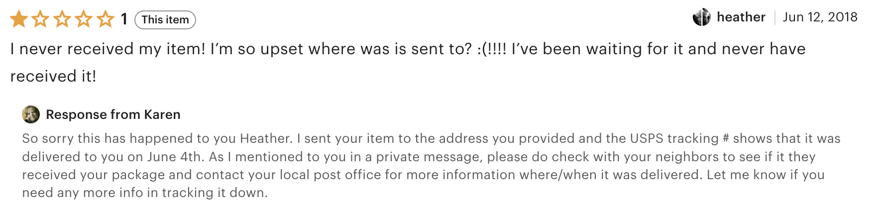 Other buyers may have a problem with their item and instead of reaching out to the seller first for help they leave a one-star review. One gal purchased a vintage jacket and I sent it off the next day. Some days later she left a one-star review berating me and asking where it was and where did I send it? The tracking showed it had been delivered six days previously to the address she gave me. I messaged her that information and her response was a little crazy but overall she wondered what I was going to do about it. I encouraged her to check with her neighbors and local postal carrier. I never heard from her again.