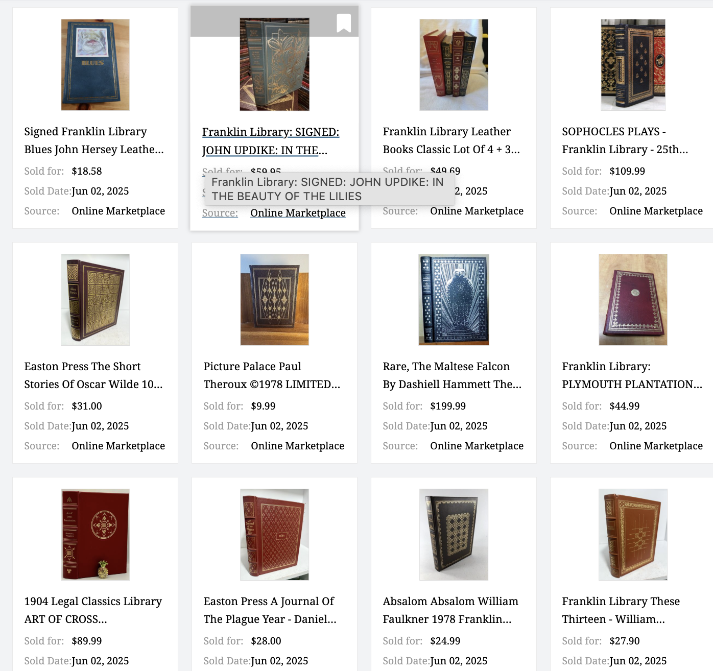 Occasionally I look on FB marketplace for possible deals and spotted this listing of leather-bound books, but yikes $6000 for 110 titles! The seller indicates that this deal is good enough for resellers to make a profit. Really??!