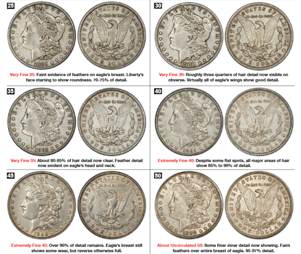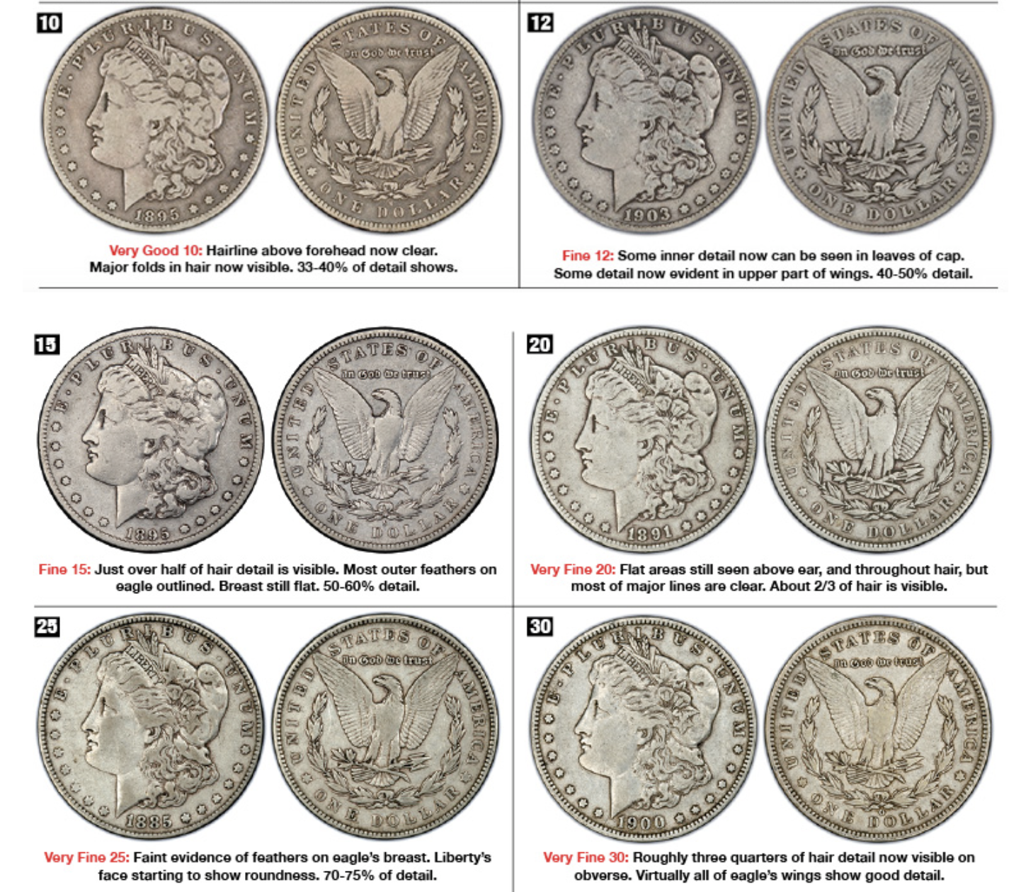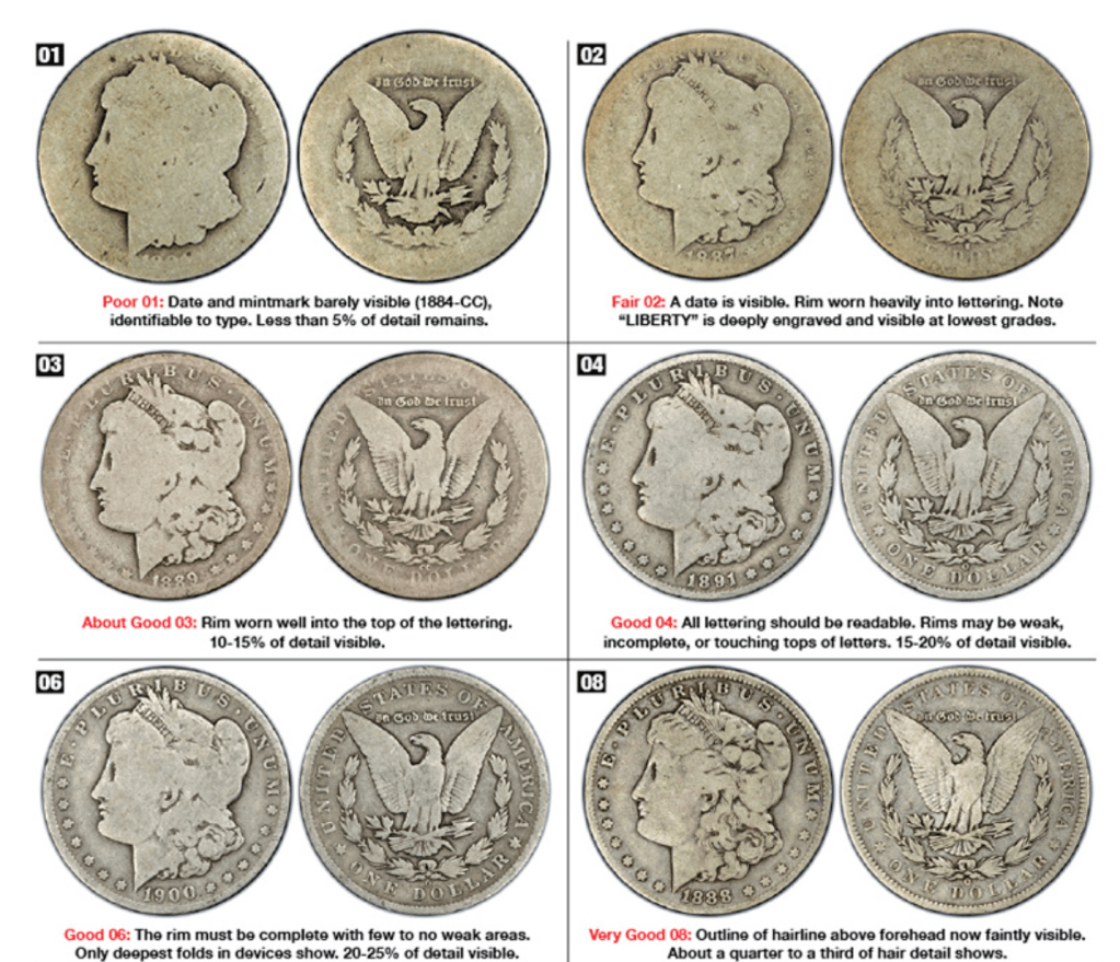 But knowing nothing about coins I knew I had to acquire at least some basic numismatics knowledge. Uncirculated coins are obviously the most desirable, but amongst those circulated there are many, many grading levels. As I started my research I found a gold mine of a site: coinagemag.com with a page devoted to “How To Grade Morgan Dollars: A Visual Guide.” Perfect!!