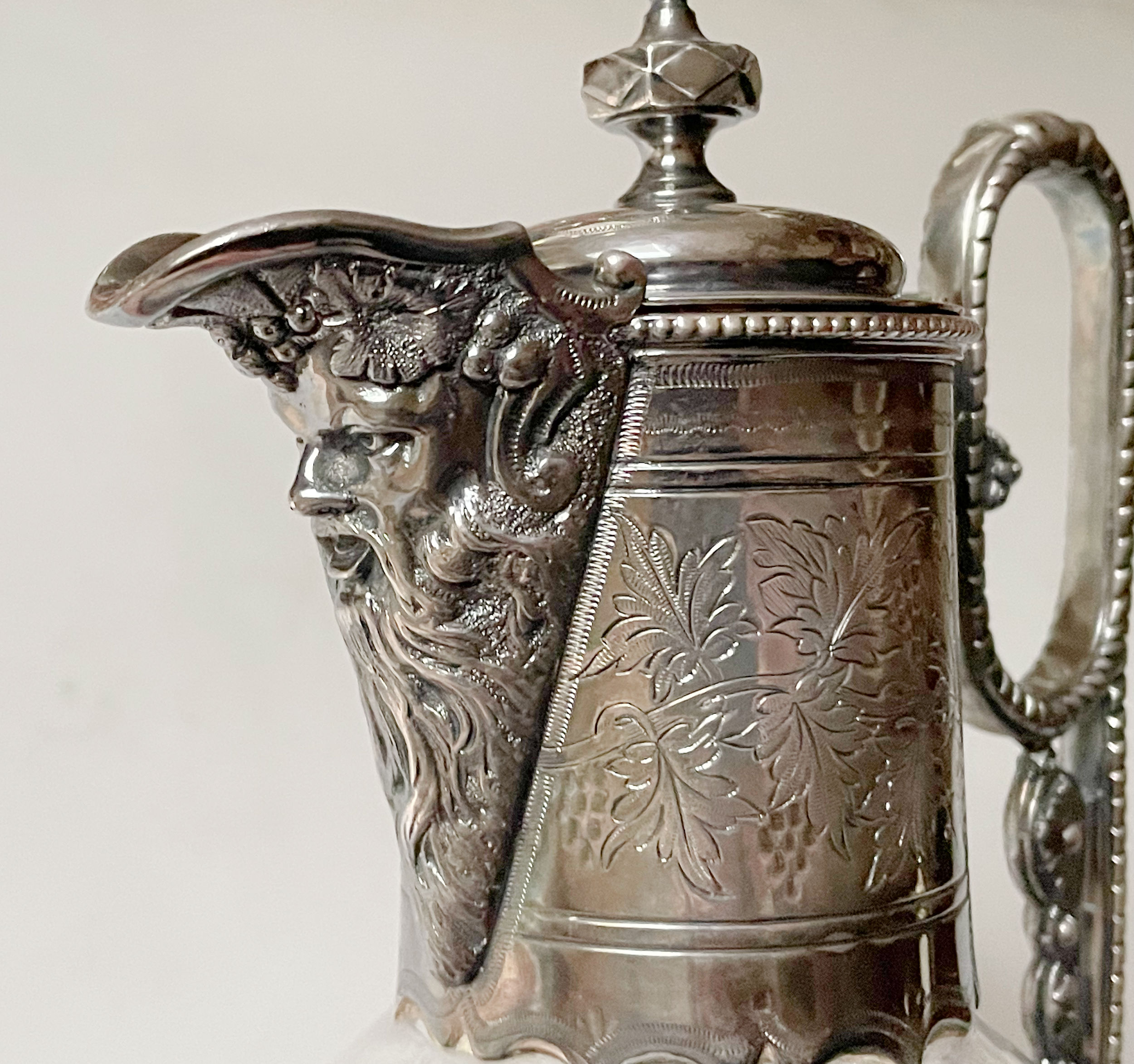 My first thrift store purchase of the month (and my only so far) was an intriguing claret jug in cut crystal with a silver plate mount featuring Bacchus, the God of wine. It could be as old as the Victorian/Edwardian eras (late 1890s to early 1900s) when these were popular, but I’m not convinced. I would expect more wear and the cut crystal shape and design seems atypical for those periods. So I’m dating it more conservatively at 60 to 90 years. Still it’s a handsome thing and would work great as a vase too.