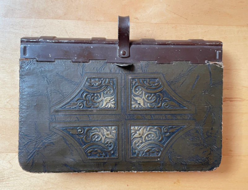 This one was in the “What-the-heck was I thinking!” category–it’s an old worn, brown silent butler/crumb catcher. I was intrigued by it because of the leather-like top with art nouveau embossing but should have never bought it. I’m smacking my head now!