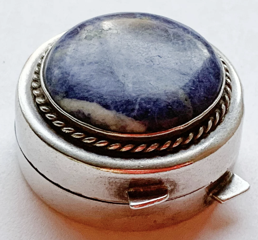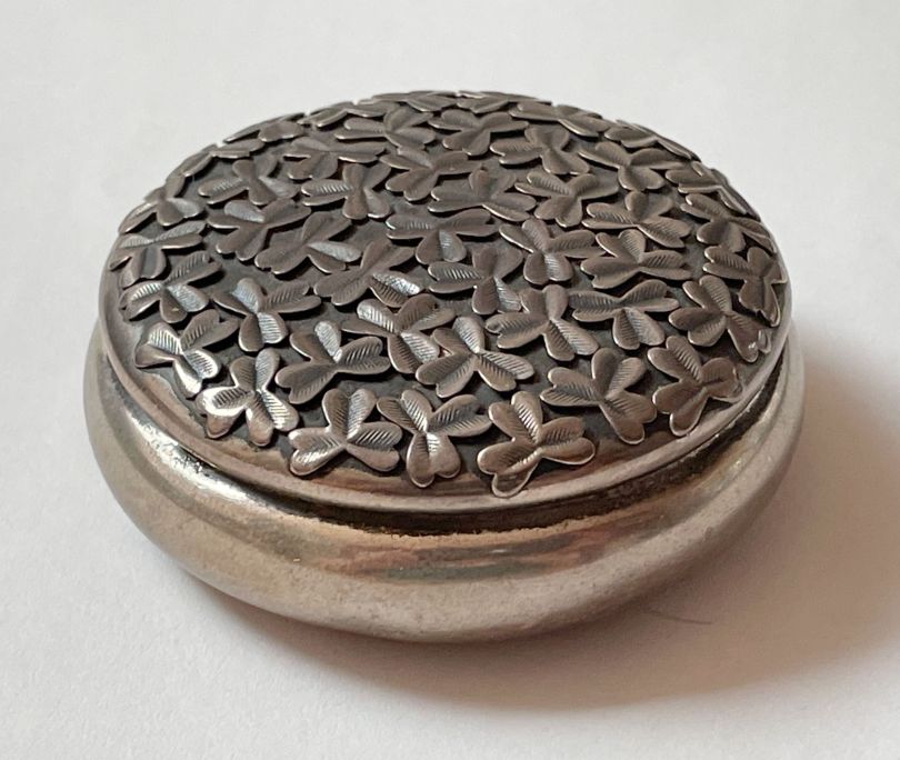 This thrift store find (paid under $5) was likely part of a dresser set with containers of varying sizes for powders, lotions and potions. Fully hallmarked but the top was plain. I would have charged more if it had had some engraving or embossing.