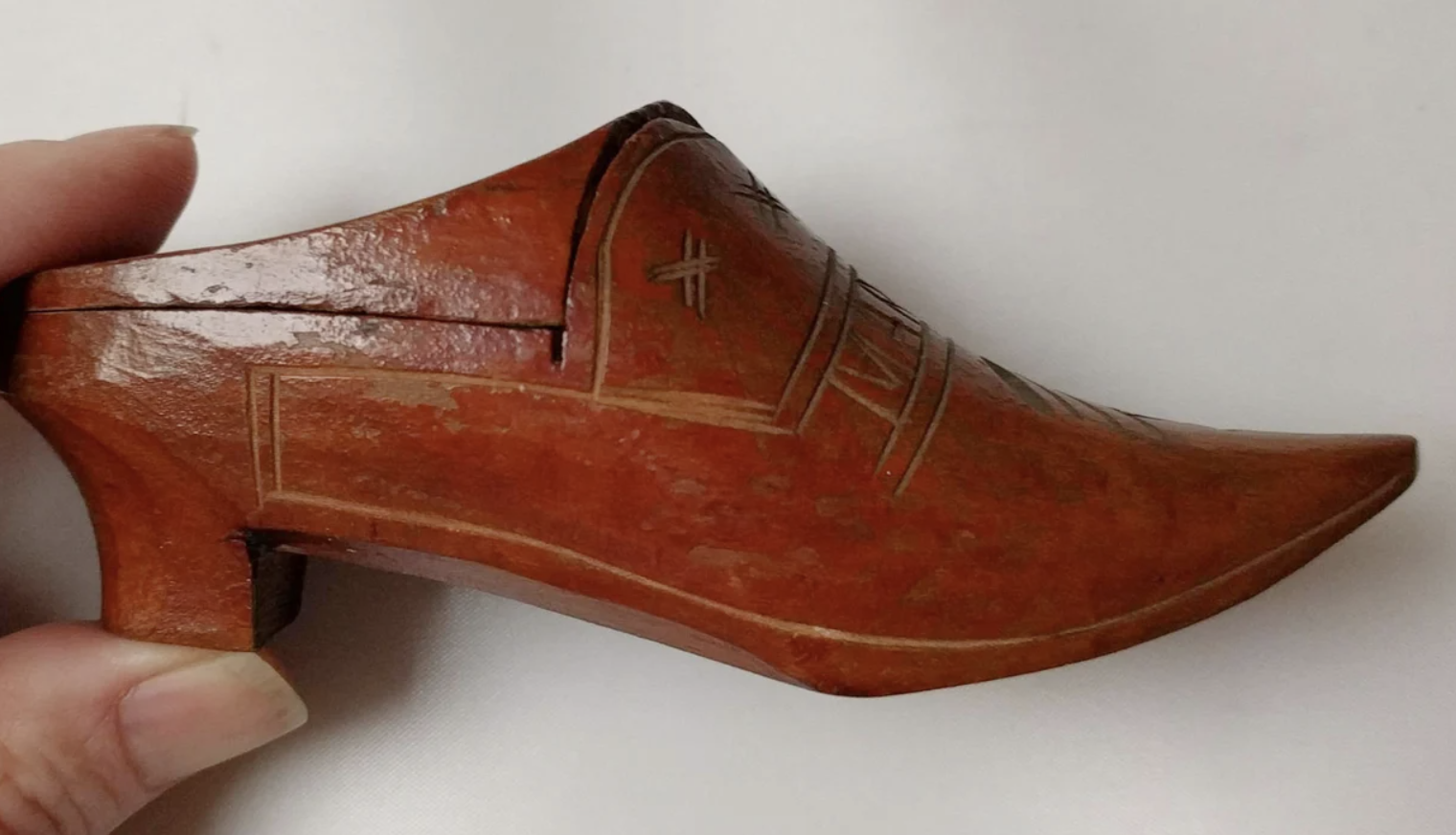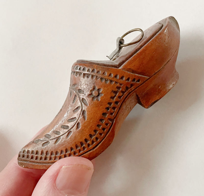Carved and embellished wood shoe snuff boxes go back centuries. This one is a more modest one from the early 20th century.