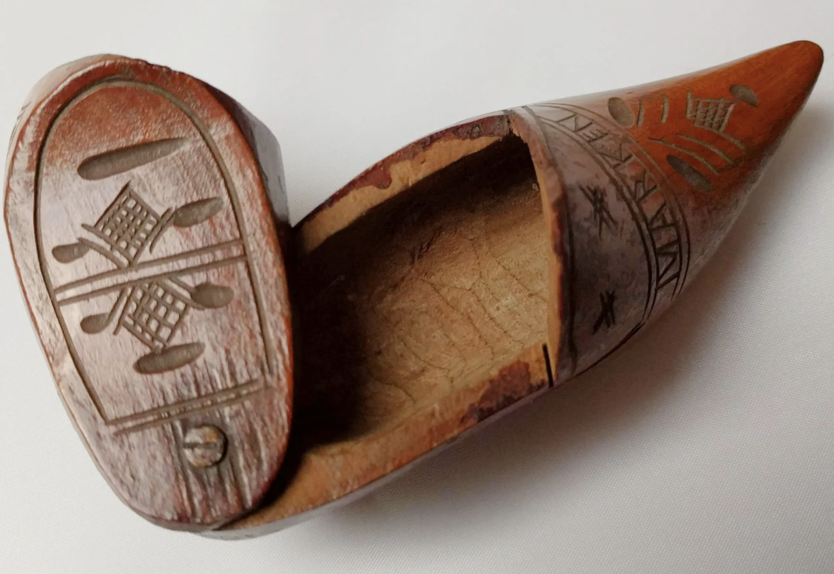 Antique Hand-Carved Dutch Wood Shoe Snuff Box, Marken Tourist Piece