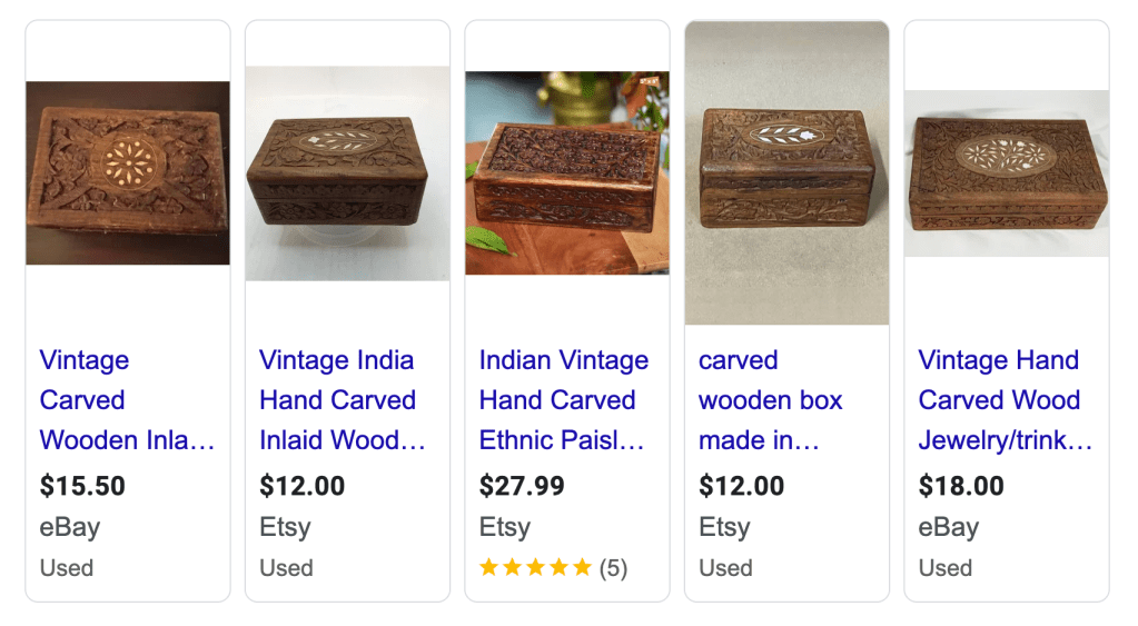 - Carved wood boxes from Poland and India. They can be nice and I’ve sold some over the years, but they are also very common and usually not worth much (under $40).