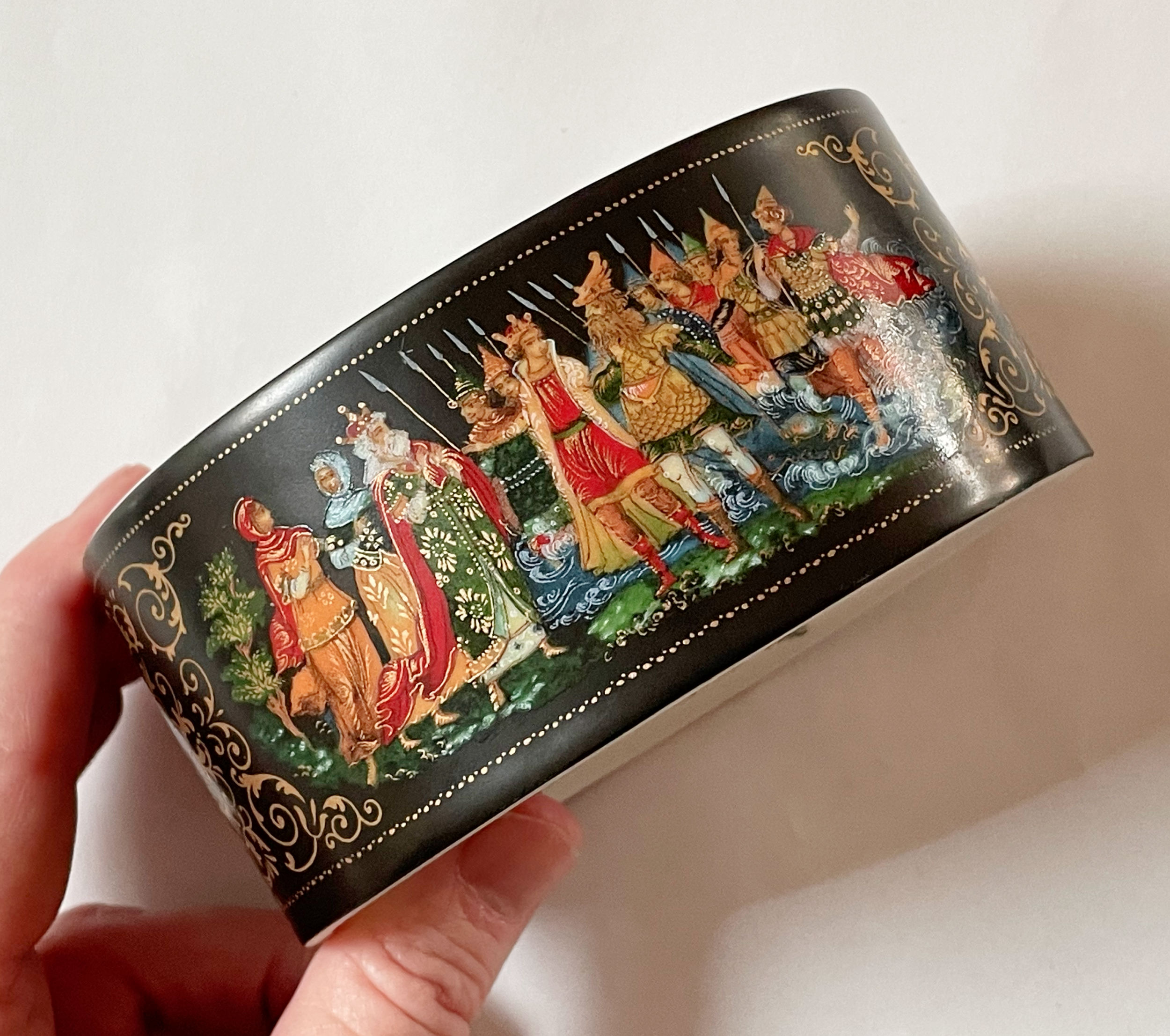 The box portrays the 1831 tale of Tsar Saltan and a swan princess. Current listed prices for this box are all over– from $20 to $399 which I find astounding. How does one decide to put a $399 price on it when most are under $100?? (Mine is listed at $48.)