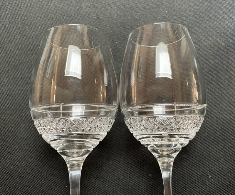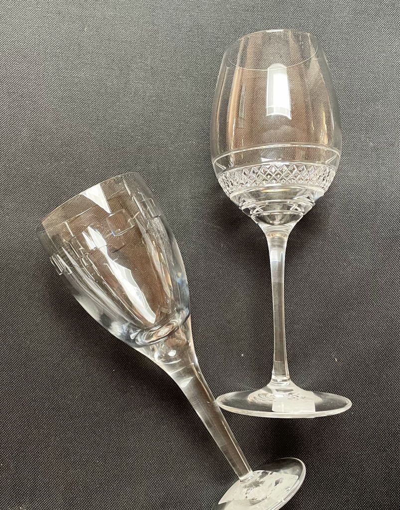 Monday morning. It’s my usual post office run, neighborhood thrift store browse and grocery shopping stop. It’s a predictable routine. But this Monday when I walked in the thrift store there were two full “new merch” carts stacked with items that hadn’t hit the shelves yet. Yeah!! And blessed be on one of the carts I found some designer John Rocha Waterford wine glasses in two different patterns–one very fresh and modern and the other more elegant and traditional. The cart was loaded with them!! WTH! Who donated all this Waterford?!