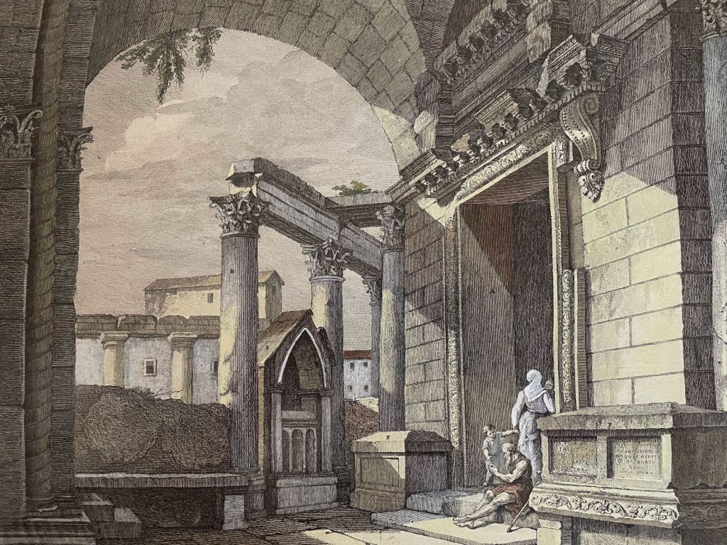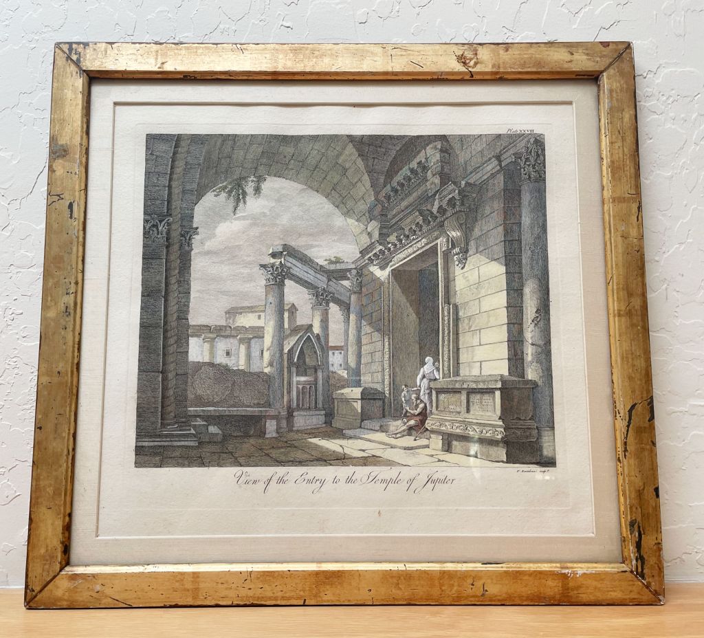 Now on Tuesday, truth be told, I went back to the thrift store to see if, by any remote chance, the few glasses I had left behind on Monday were still there…alas not. Well, of course not. But I did find this antique hand-tinted engraving by Francesco Bartolozzi (1727-1815). The old frame, possibly gold leaf, is pretty beat up, but it seems to suit the print which is “View of the Entry to the Temple of Jupiter.” The print may be a later restrike rather than original (don’t know for sure), but it is antique and beautifully rendered.