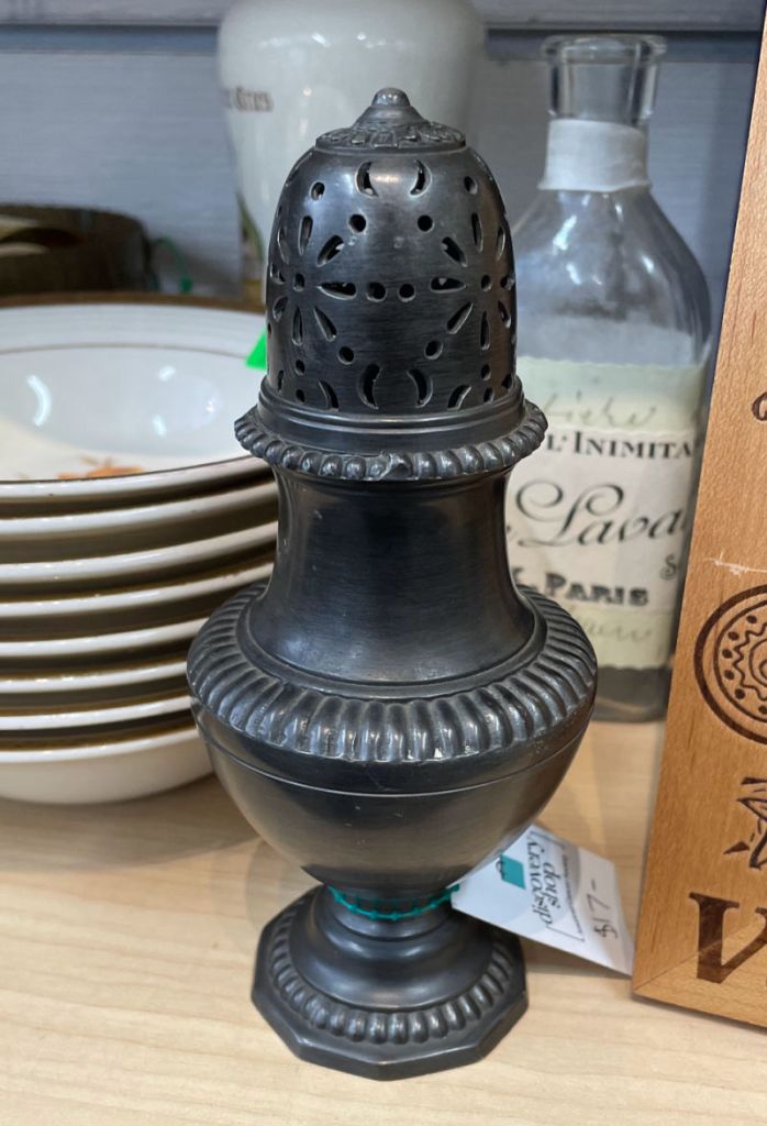 Started the morning receiving a couple of sales including another loaded charm bracelet. (So happy to see my bracelets finding new homes.) Later after an appointment I hit up two boutique thrift stores on my way home. Honestly though, I’m trying to figure out how they can even call these “thrift stores” anymore. I liked this vintage, metal sugar shaker from France, but it was $17 and a thrift store price IMHO should have been $5 or under. I found one on eBay being sold for $19.99.
