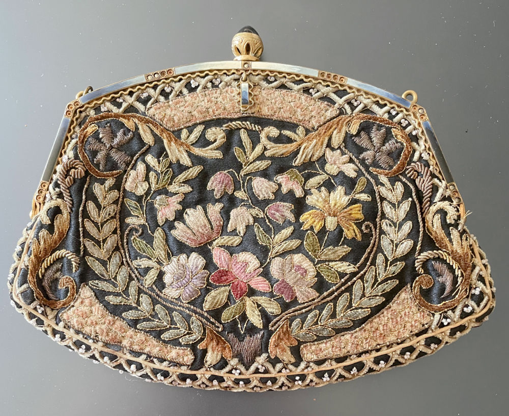 This scarce antique Austrian embroidered purse with gold thread, tiny beads, enamel frame trim and marcasites was lovely. Most of the marcasites are missing as is the chain, but the marcasites can be replaced so it wasn’t a huge concern. Overall the condition is amazing and I had a “yes, please” moment.