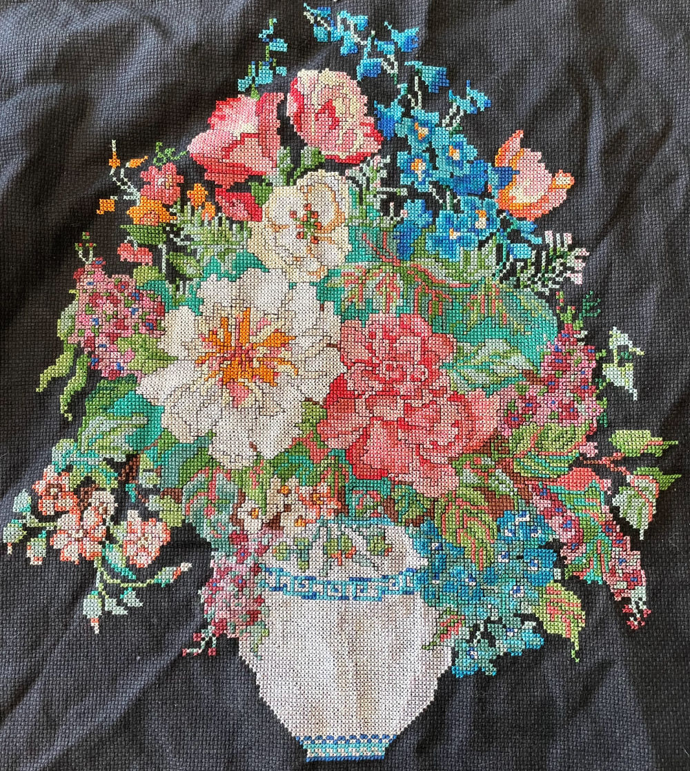 Turns out it was made from a 1991 kit from Something Special titled “Mixed Floral on Black” and it’s ready to be framed or used in another way. Reason I bought this? It’s perfect for a cottage-core, grandma-core or traditional decor house!