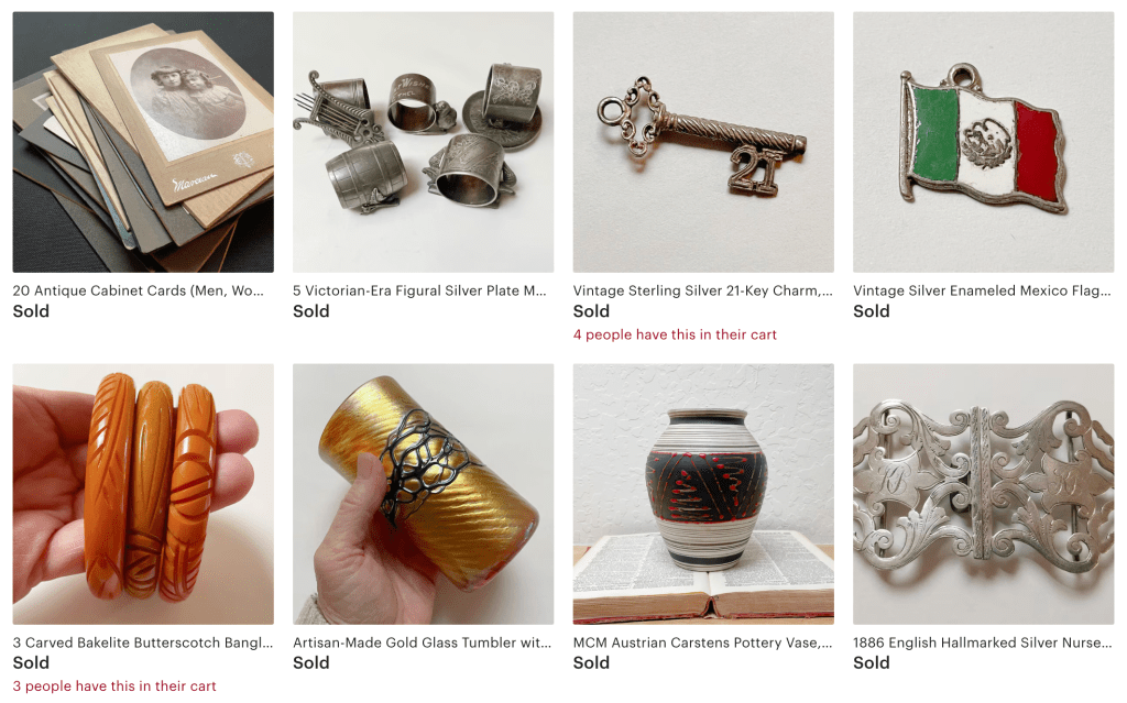 The sale of the pottery vase and nurse’s sterling silver buckle were particularly satisfying as I’ve had them in my store for three years. The just-listed gold glass tumbler (paid $2.69) sold in a few days for $45.