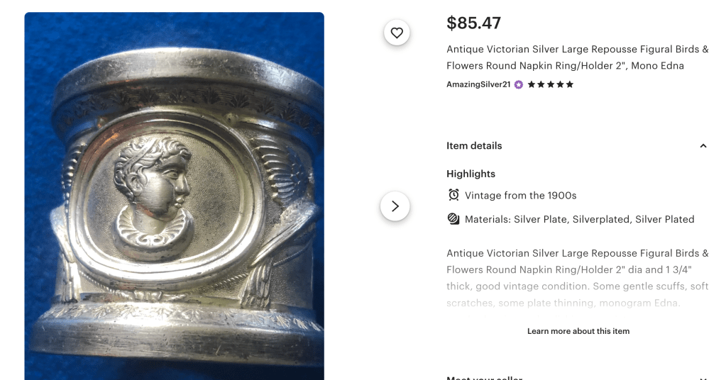 I found a similar napkin ring that sold on Etsy for $85! (I listed my jug for $68.)