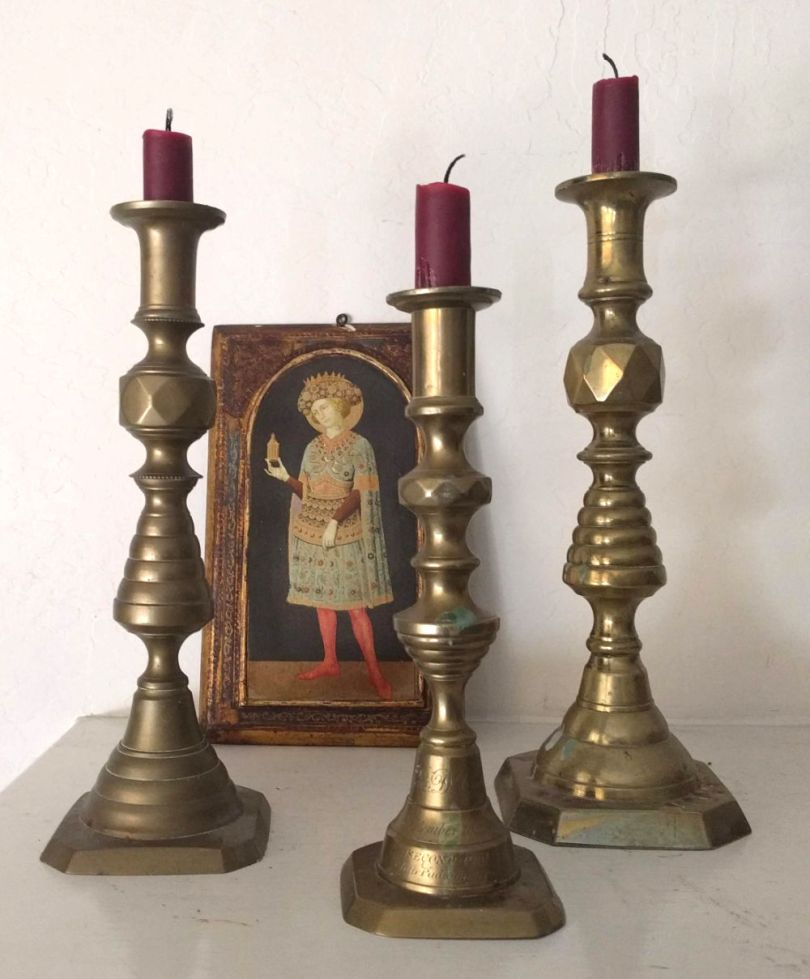 For those of us in the Northern Hemisphere, Christmas falls in our darkest season and candlelight is always a welcome part of the decor and festivities. I have loved old brass beehive candlesticks for decades and almost always have some on our living room mantel. This time of year I pair them with some “Christmasy” item. One year it was a decoupaged Italian gilded plaque of a magi from N. G. Fabriano’s “Adoration of the Magi.” (I was sad to see this magi sell.)